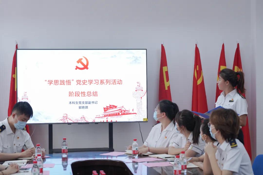 支部副书记郭艳琪从学(党史学习笔记展示)、思(专题沙龙研讨)、践(主题社会实践)、悟(微党课视频宣讲)四个方面总结了党史学习教育“学思践悟”系列活动。