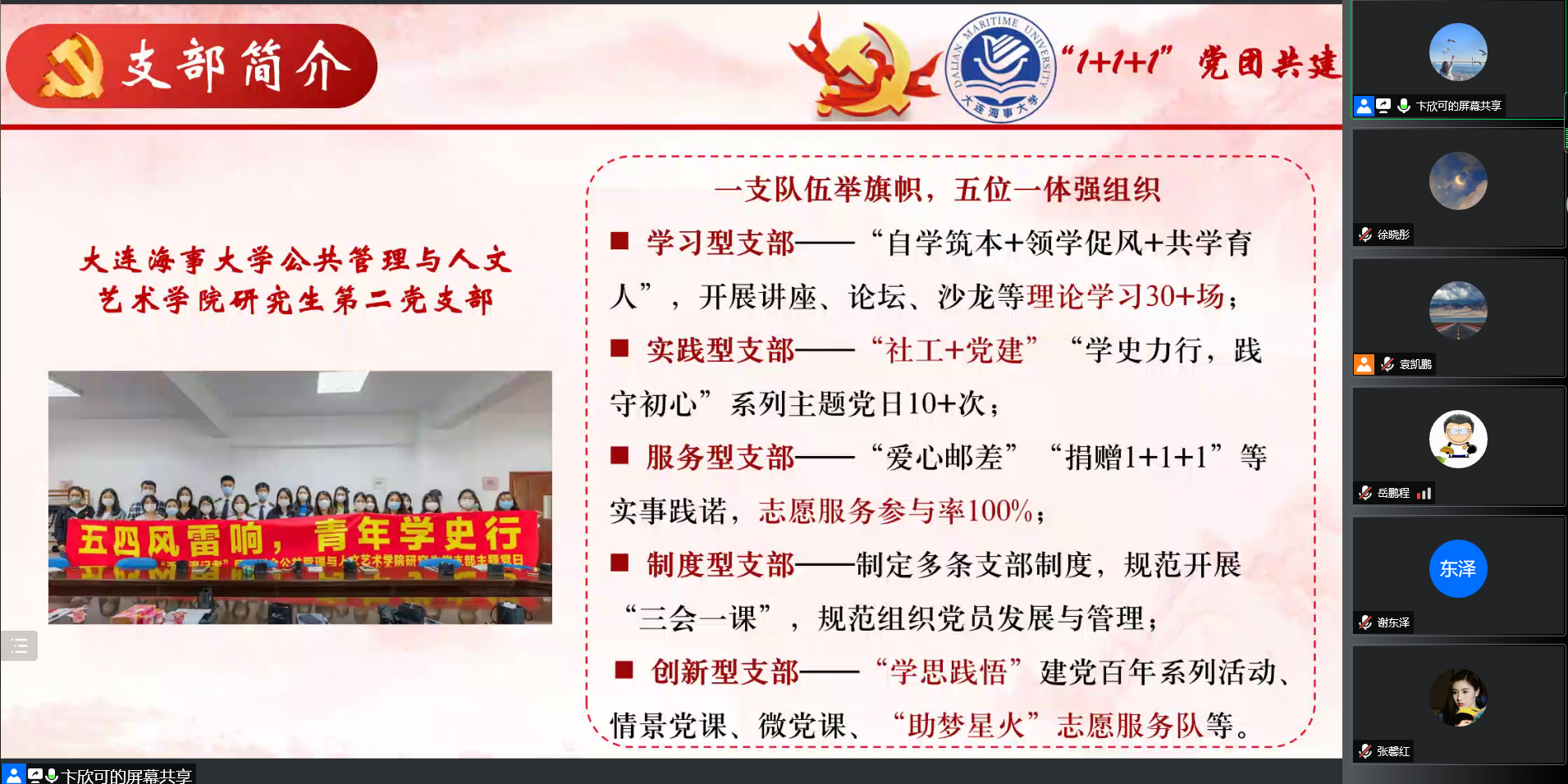 最后,大连海事大学公共管理与人文艺术学院研究生第二党支部书记卞欣可围绕“1+5+N”支部建设体系,即“一支队伍举旗帜,五位一体强组织,N项服务展专业”,简要介绍党支部在“助梦星火”党员志愿服务团队、“学思践悟”特色活动、“社工+党建”支部建设等方面具体成效。