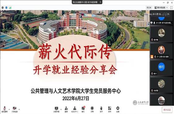 为帮助同学们合理规划学业、职业生涯,增强专业学习主动性、能动性,进一步发挥朋辈引领作用,6月27日19时,公共管理与人文艺术学院线上举办“薪火代际传”——升学就业经验分享会,分享会由学院大学生党员服务中心承办,指导员郭艳琪、2022届优秀毕业生代表、2020和2021中队全体同学参会,主要分为就业、保研、考研三个部分。