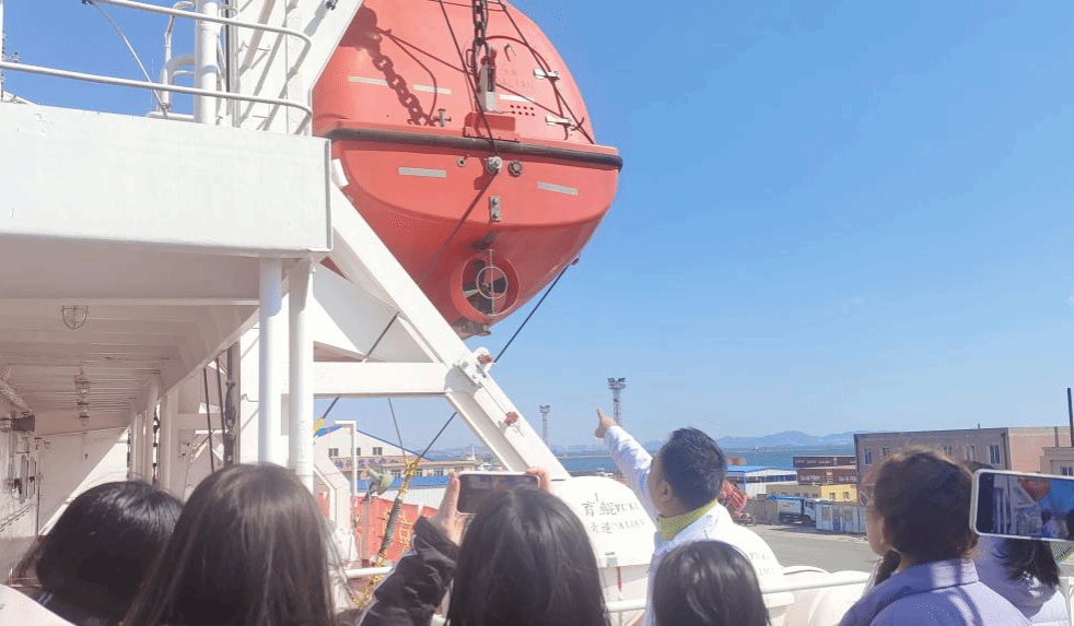 在甲板上,讲解员围绕着一艘救生船展开讲解并积极回答大家提出的问题。他详细介绍了救生船的构造与功能,从船体材料的选择到内部设施的布局,从应急启动机制到与母船的通信系统,每一处细节都体现了现代航海技术的先进性和对生命安全的高度重视。党员们在聆听讲解的过程中,深刻感受到了航海事业中对安全的极致追求和对生命的敬畏之心。