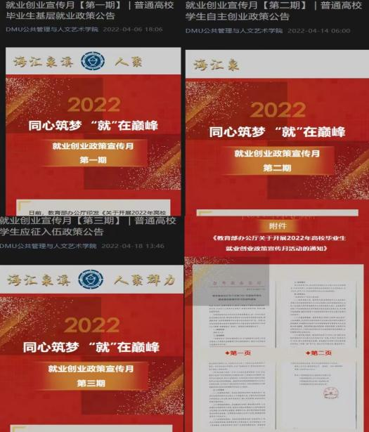 根据教育部办公厅印发的《关于开展2022年高校毕业生就业创业政策宣传月活动的通知》,学院利用官方公众号、毕业班中队公众号等载体编发系列政策公告,对毕业生就业、创业、征兵等分模块拆分、解读,分四期进行推送和展示,方便毕业生查阅。