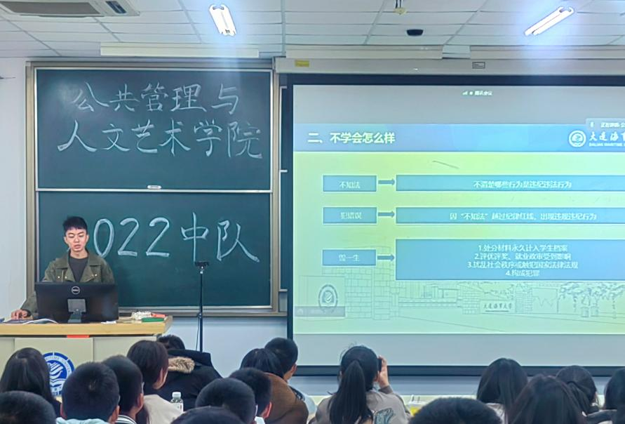 当前,面对纷繁复杂的社会环境,部分学生没有重视学校的违纪处分办法,这样的认识是绝对错误且不可取的。为有效落实学生工作部相关要求,同时让学生更加了解违纪处分办法,11月23日,公共管理与人文艺术学院2022中队召开《大连海事大学学生违纪处分办法》(以下简称《办法》)专题解读会议,旨在提醒学生规范自身行为,增强合规意识。会议由指导员焦兴华主讲,中队全体学生参会。