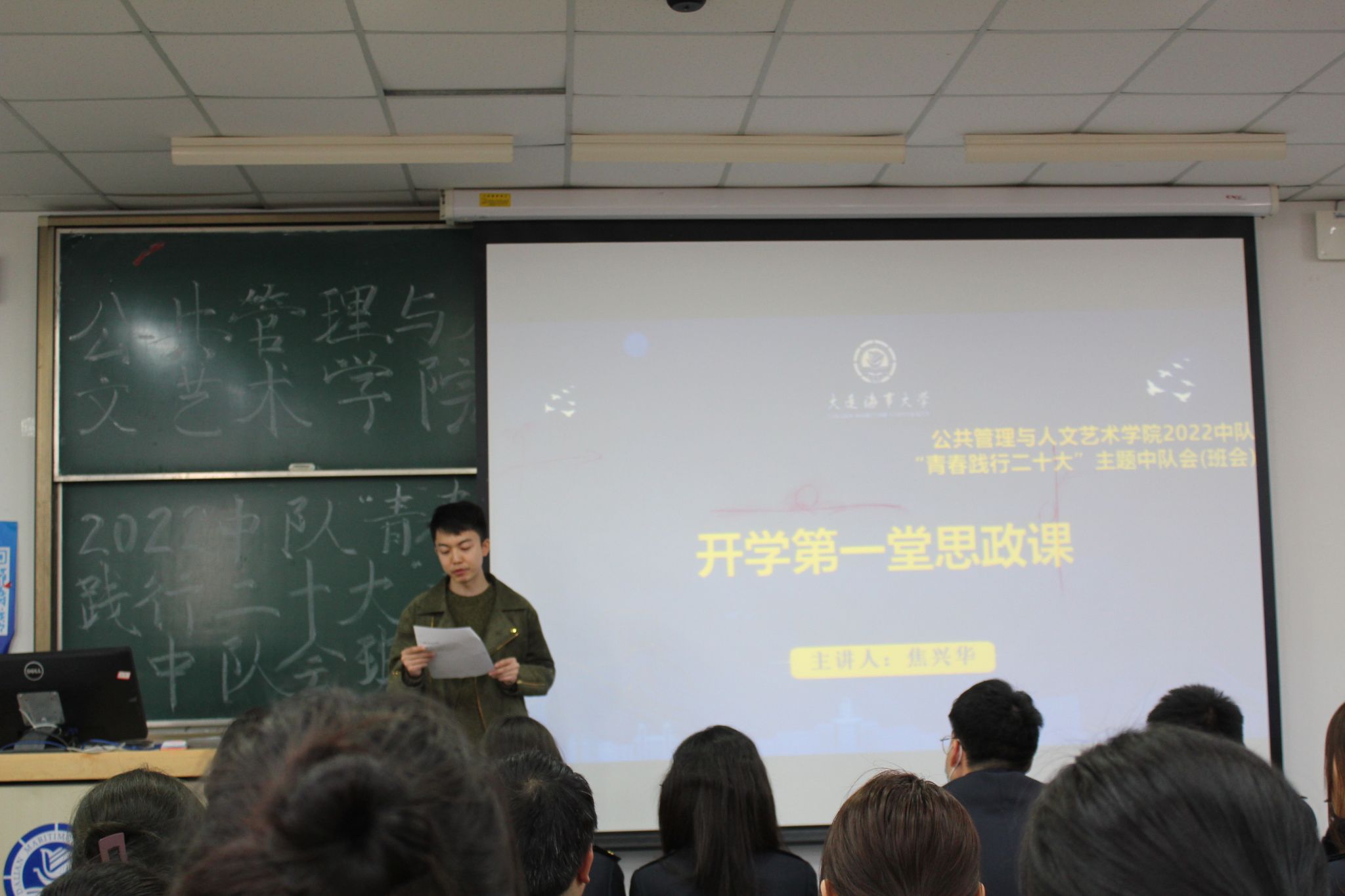 新学期伊始,为了让学生们进一步了解海大、适应海大,树立新的奋斗目标,同时让中队更好地针对学生开展思想政治教育工作,公共管理与人文艺术学院2022中队于2023年3月4日以“青春践行二十大”为主题,开展“开学第一次主题中队会”,旨在弘扬青春正能量,积极奋进新征程。会议由中队长谢元壹同学主持,中队指导员焦兴华、全体同学参加。