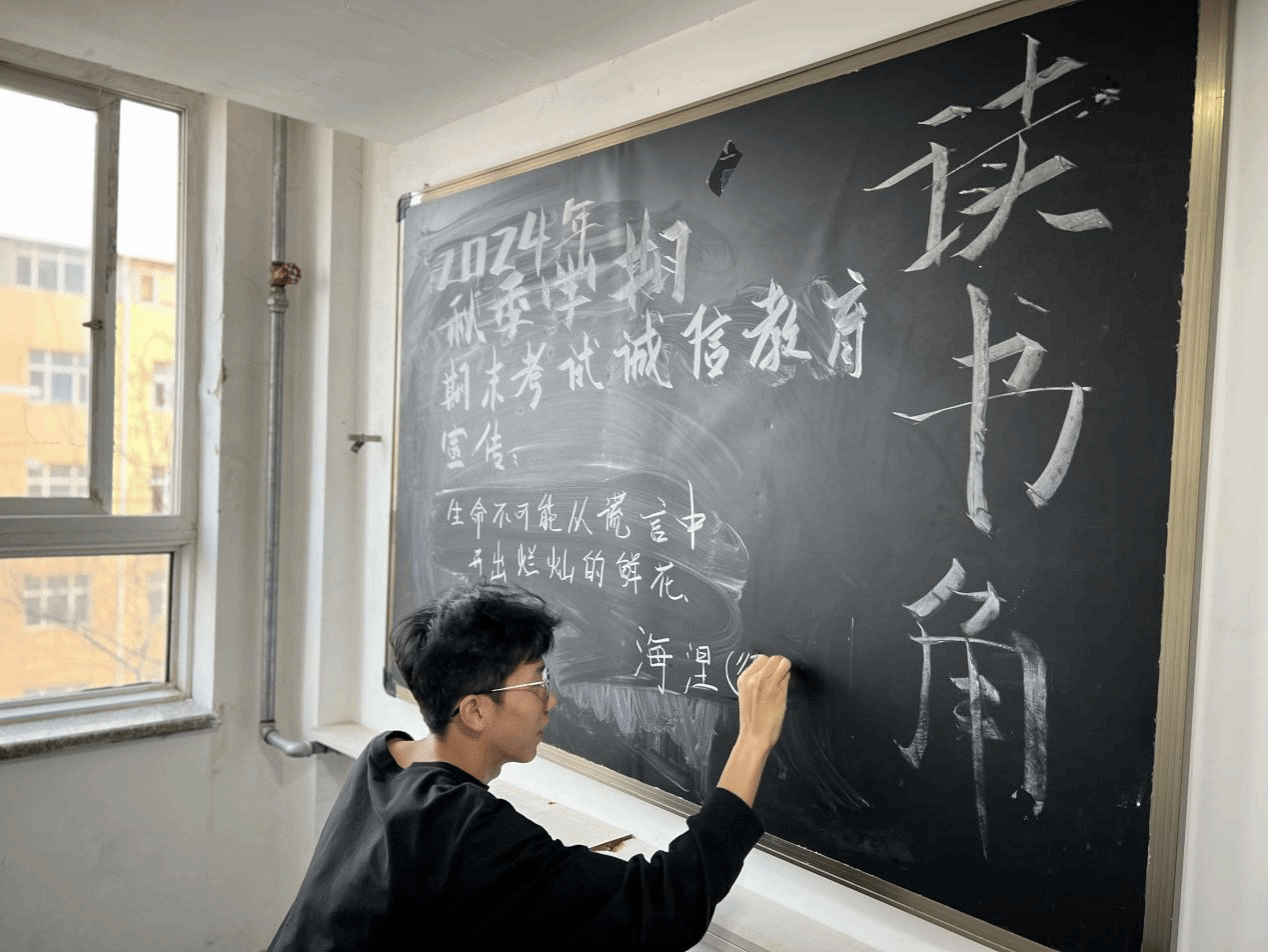 学院于学生宿舍公共空间改造的学习角进行诚信标语宣传,通过对寝室环境的改造,深化诚信教育力度,营造诚信考试氛围。