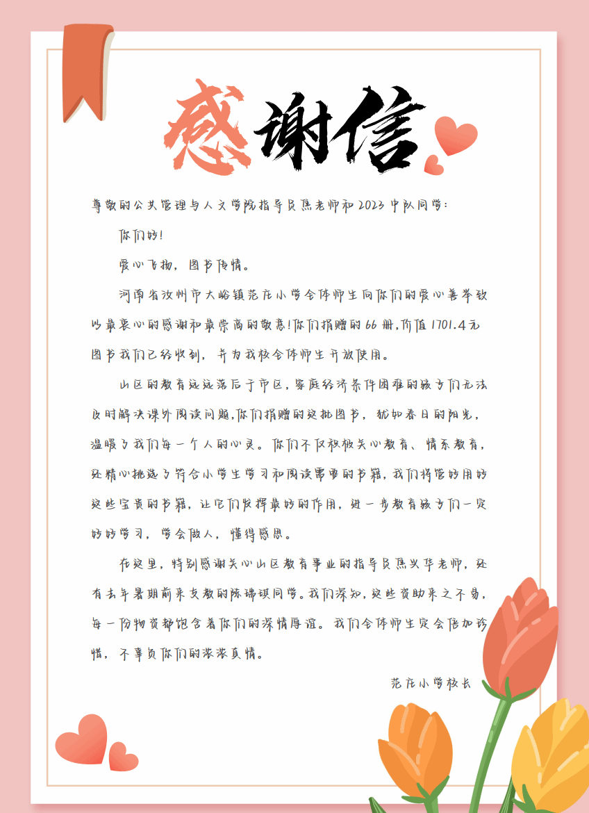 在人文学院2023中队团总支的共同努力下,承载着爱心的图书跨越山海,抵达河南省汝州市大峪镇范庄小学。