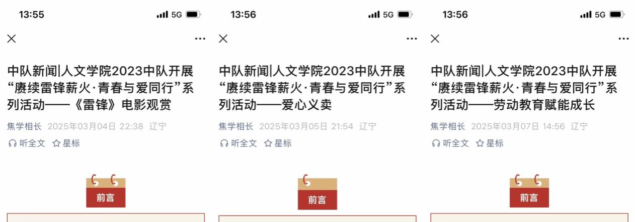 为深入学习贯彻党的二十大精神,弘扬新时代雷锋精神,在公共管理与人文学院团委的指导支持下,人文2023中队团总支在今年3月-4月精心策划并开展“赓续雷锋薪火·青春与爱同行”系列活动,引导人文学子在学习中感悟雷锋精神,在实践中践行青春使命,争做新时代雷锋精神的传承者和践行者。