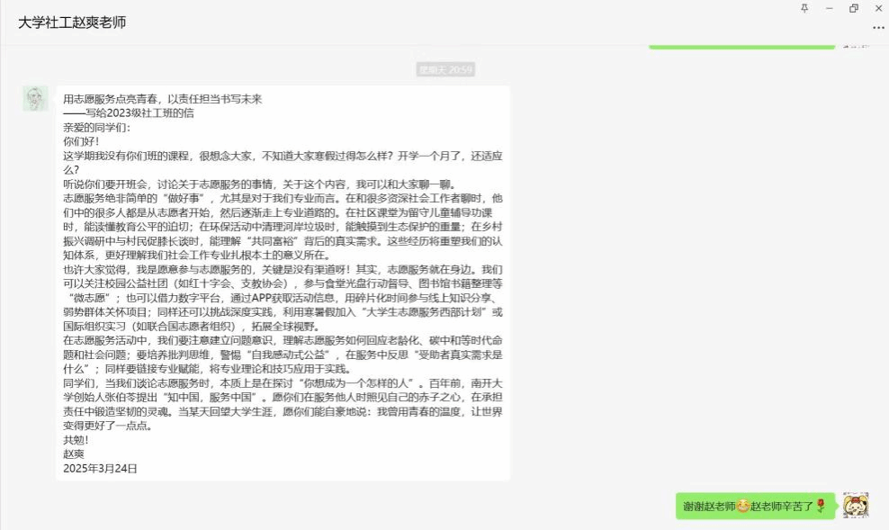 3.内容:资深志愿者分享“山区支教”“社区养老”等真实服务经历;班主任赵爽老师解析志愿服务与专业实践的关联性;“老师来信”环节朗读受助者感谢信,强化情感共鸣。