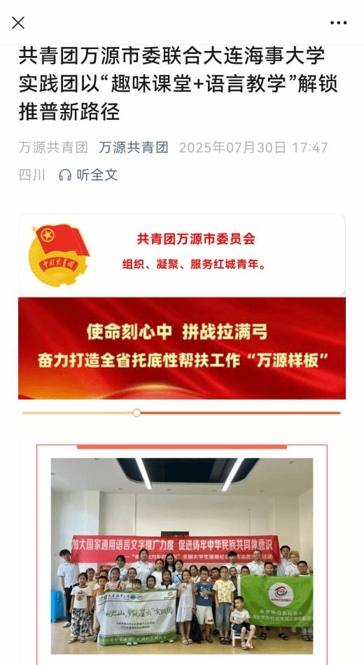为贯彻落实习近平总书记在全国教育大会上的重要讲话和关于语言文字的重要指示批示精神,加大国家通用语言文字推广力度,引导人文学子为中国式现代化贡献青春力量,公共管理与人文学院组建“声动巴山,梦筑星火”实践团,前往四川省达州市万源市开展社会实践活动。此次活动反响热烈,受到共青团万源市委官方报道,获万源市古东关街道和相关社区一致好评。