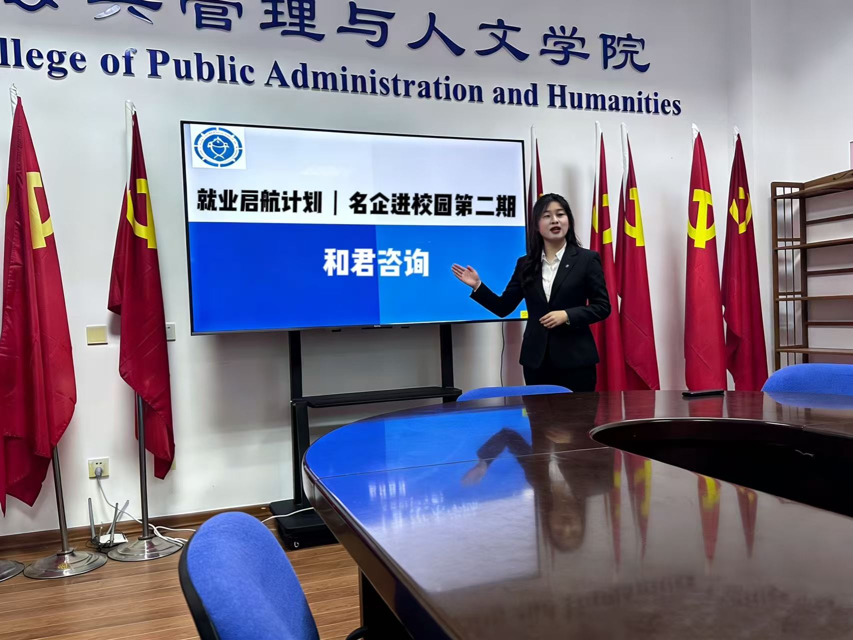2025年11月23日下午14时,公共管理与人文学院“就业启航计划|名企进校园系列活动”第二期在瀚海一党员活动室成功举办。本期活动邀请国内知名咨询机构——和君咨询合伙人走进校园,为同学们深入解读公共政策咨询行业的发展前景与人才需求。